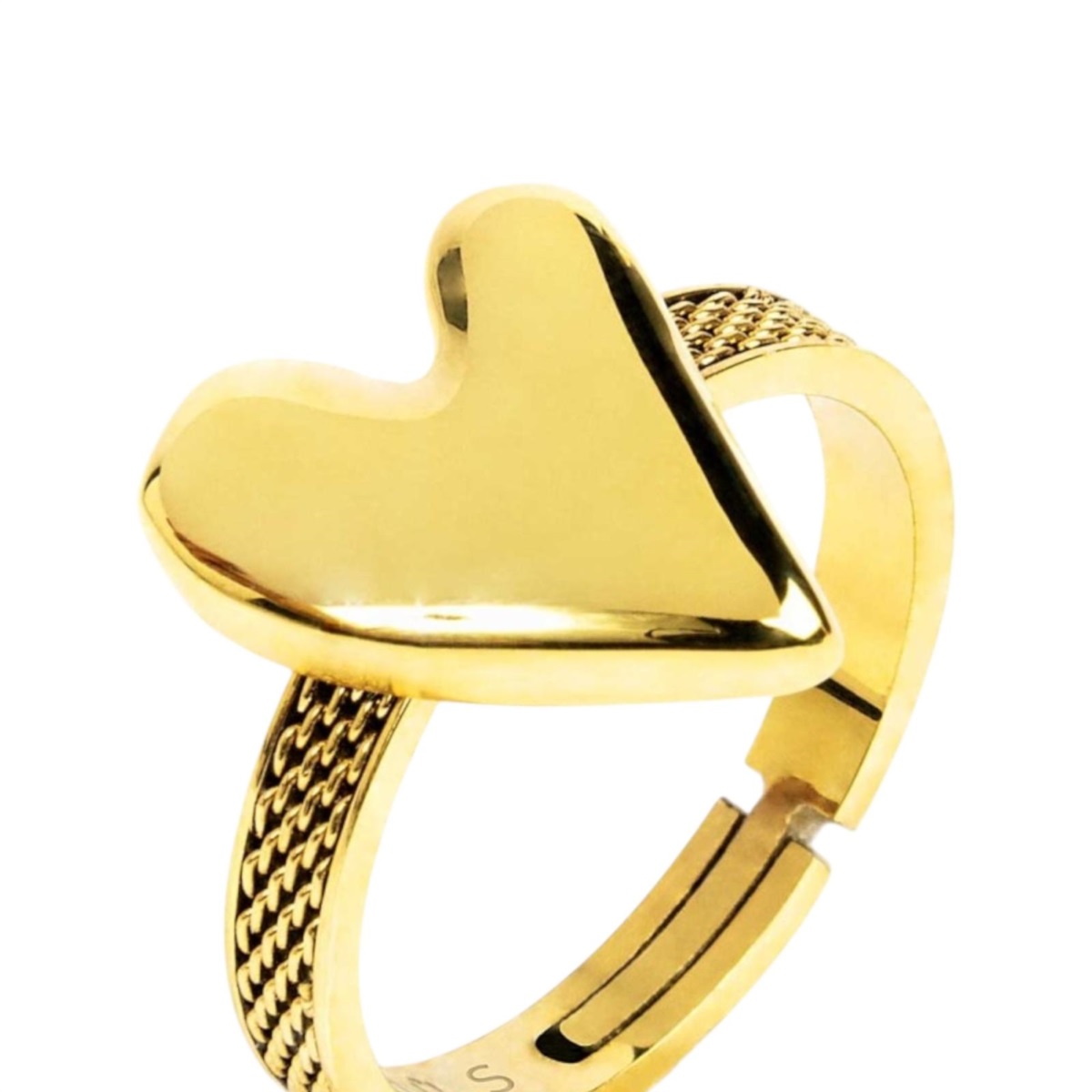 Anello donna Marlù della collezione Vision realizzato in acciaio color oro giallo a fascetta con trama a catena mesh e al centro un cuore irregolare.