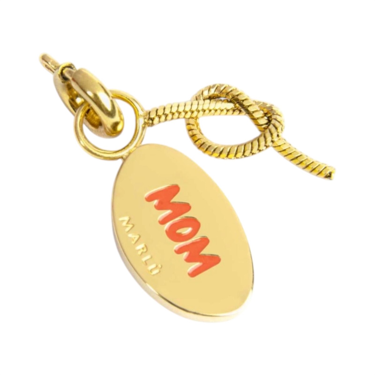 Charm donna Marlù della collezione Knoted To My Heart realizzato in acciaio color oro giallo con nodo in catena snake e piastrina smaltata rossa con scritta "MAMMA" in rilievo e sul retro la scritta "MOM" smaltata rossa.