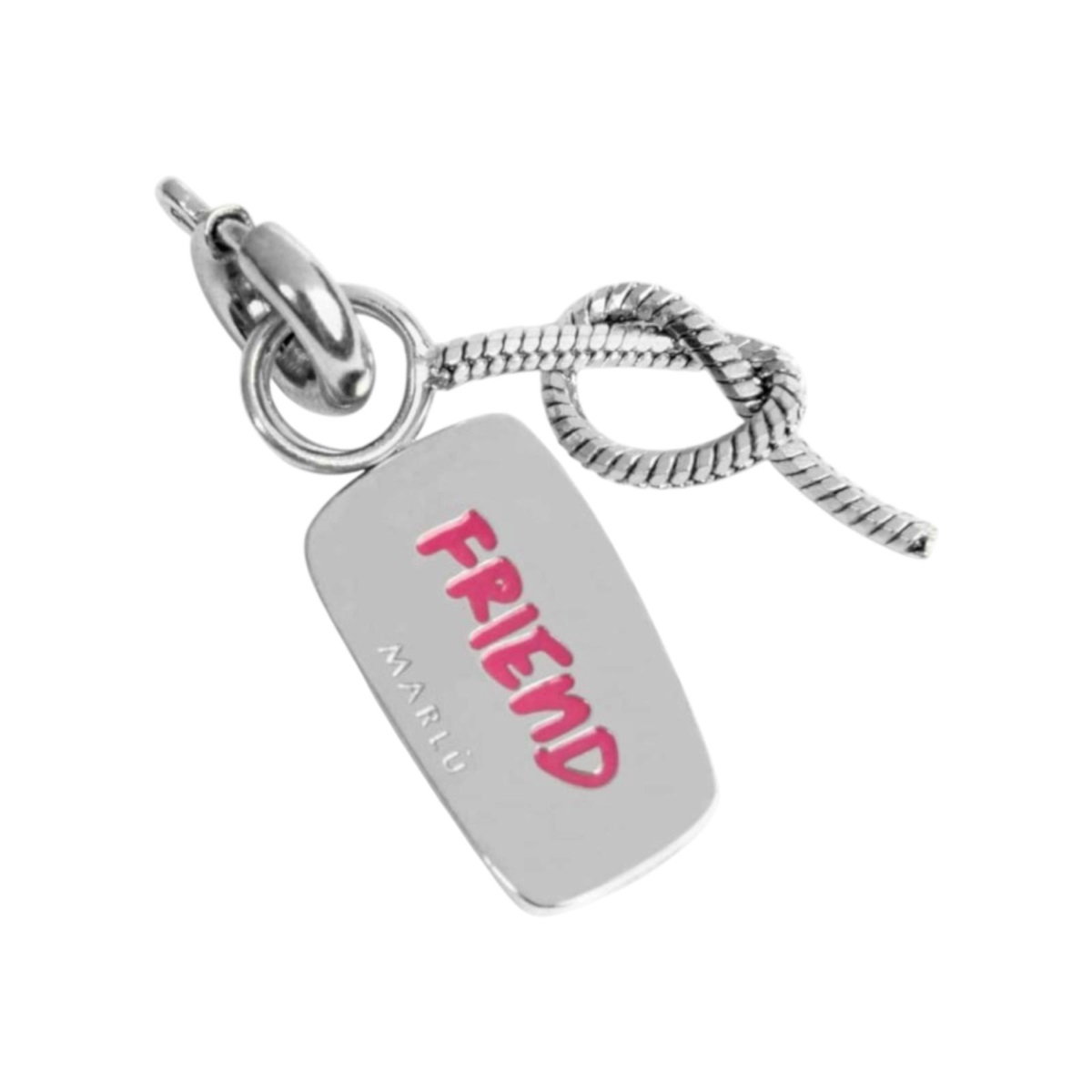 Charm donna Marlù della collezione Knoted To My Heart realizzato in acciaio color silver con nodo in catena snake e piastrina smaltata rosa con scritta "AMO" in rilievo e sul retro la scritta "FRIEND" smaltata rosa.