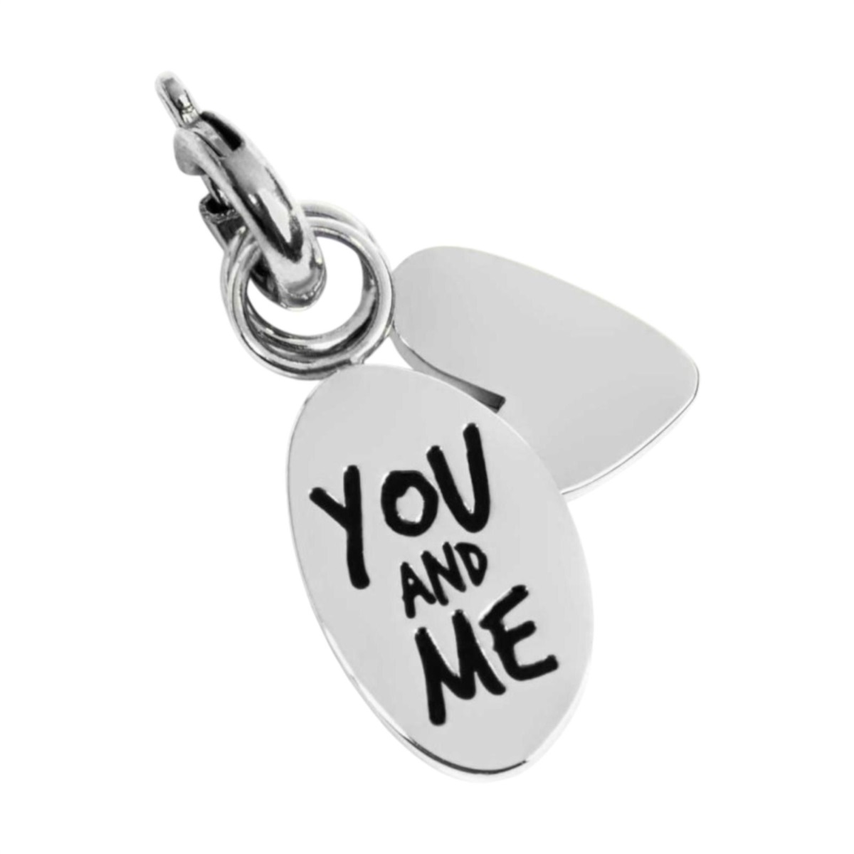 Charm donna Marlù della collezione Knoted To My Heart realizzato in acciaio color silver con piastra ovale con scritta "YOU AND ME" smaltata nera, sul retro un cuore smaltato rosso e una piastra a forma di cuore.