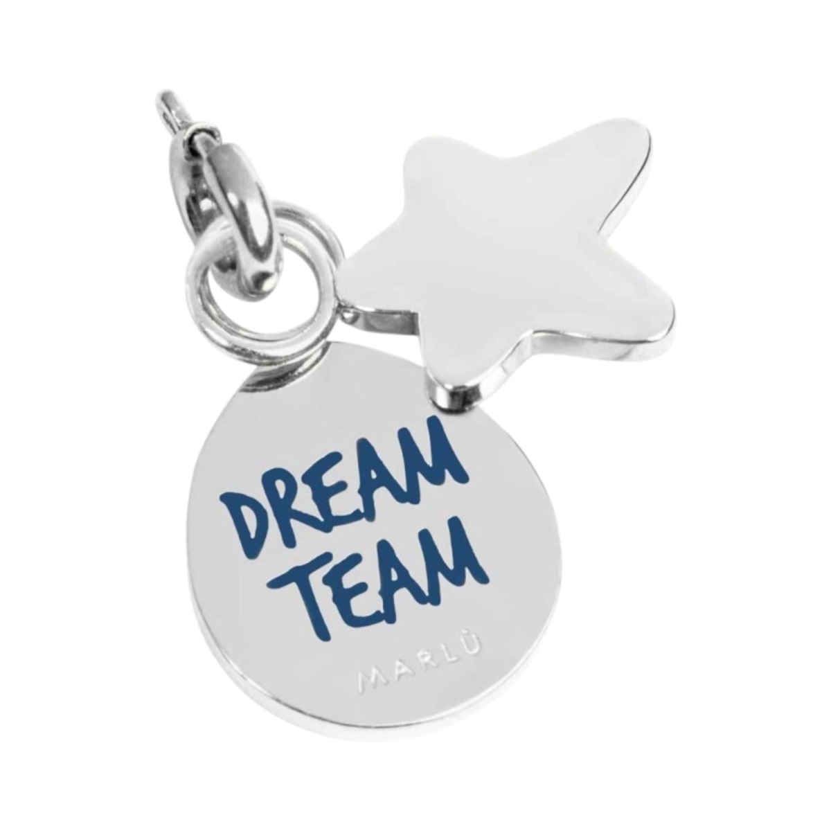 Charm donna Marlù della collezione Knoted To My Heart realizzato in acciaio color silver con piastra tonda con scritta "SQUADRA DEI SOGNI" smaltata bianca, sul retro la scritta "DREAM TEAM" smaltata blu e una stella.