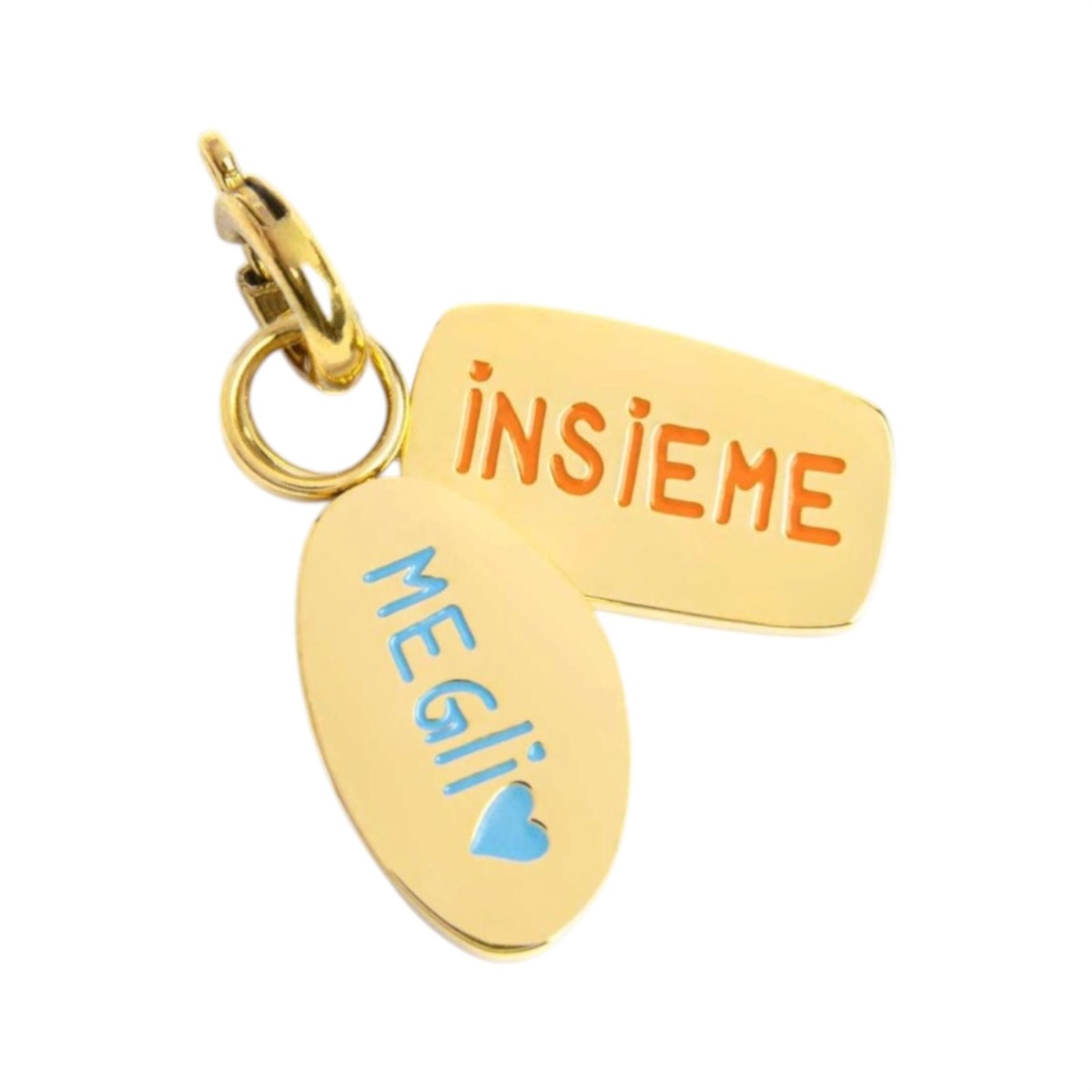 Charm donna Marlù della collezione Knoted To My Heart realizzato in acciaio color oro giallo con piastra ovale con scritta sul fronte "MEGLIO"e sul retro "BETTER" smaltata azzurra, mentre sulla piastra rettangolare c'è la scritta sul frote "INSIEME" e sul retro "TOGETHER" smaltata arancione.