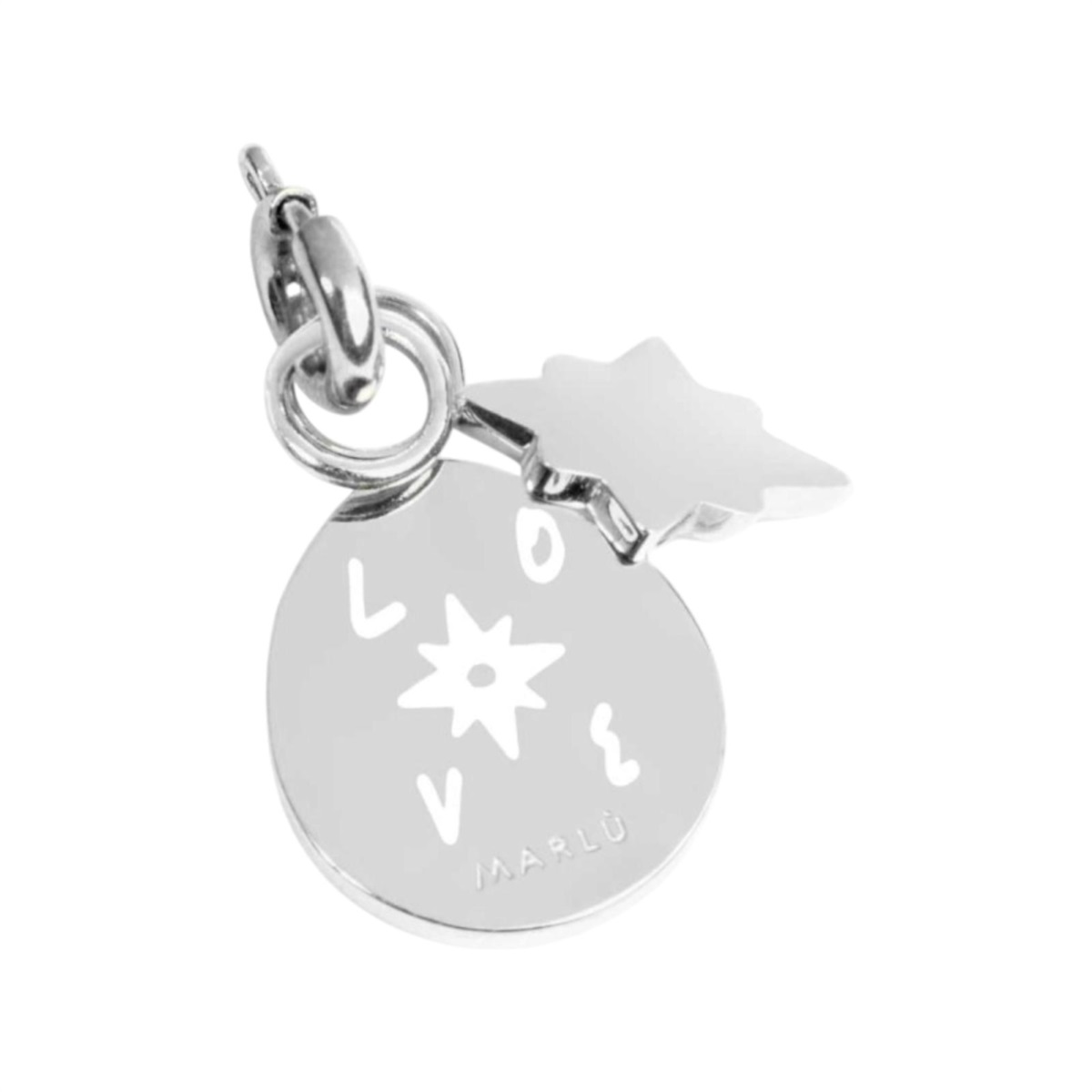 Charm donna Marlù della collezione Knoted To My Heart realizzato in acciaio color silver con piastra tonda con scritta "IN MY HEART" smaltata bianca e sul retro la scritta "LOVE" e la rosa dei venti smaltata bianca e pendente a forma di rosa dei venti.