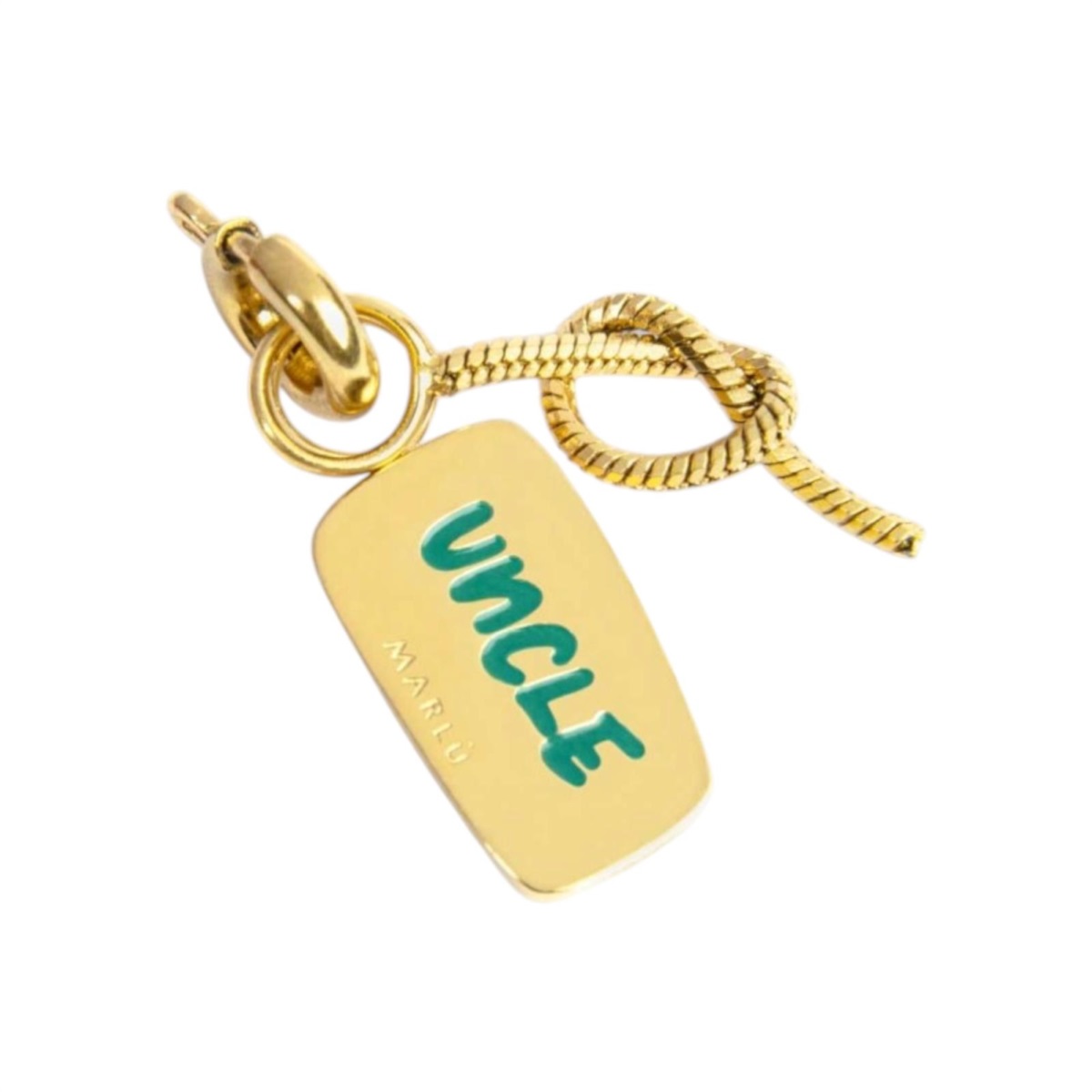 Charm uomo Marlù della collezione Knoted To My Heart realizzato in acciaio color oro giallo con nodo in catena snake e piastrina smaltata verde con scritta "ZIO" in rilievo e sul retro la scritta "UNCLE" smaltata verde.