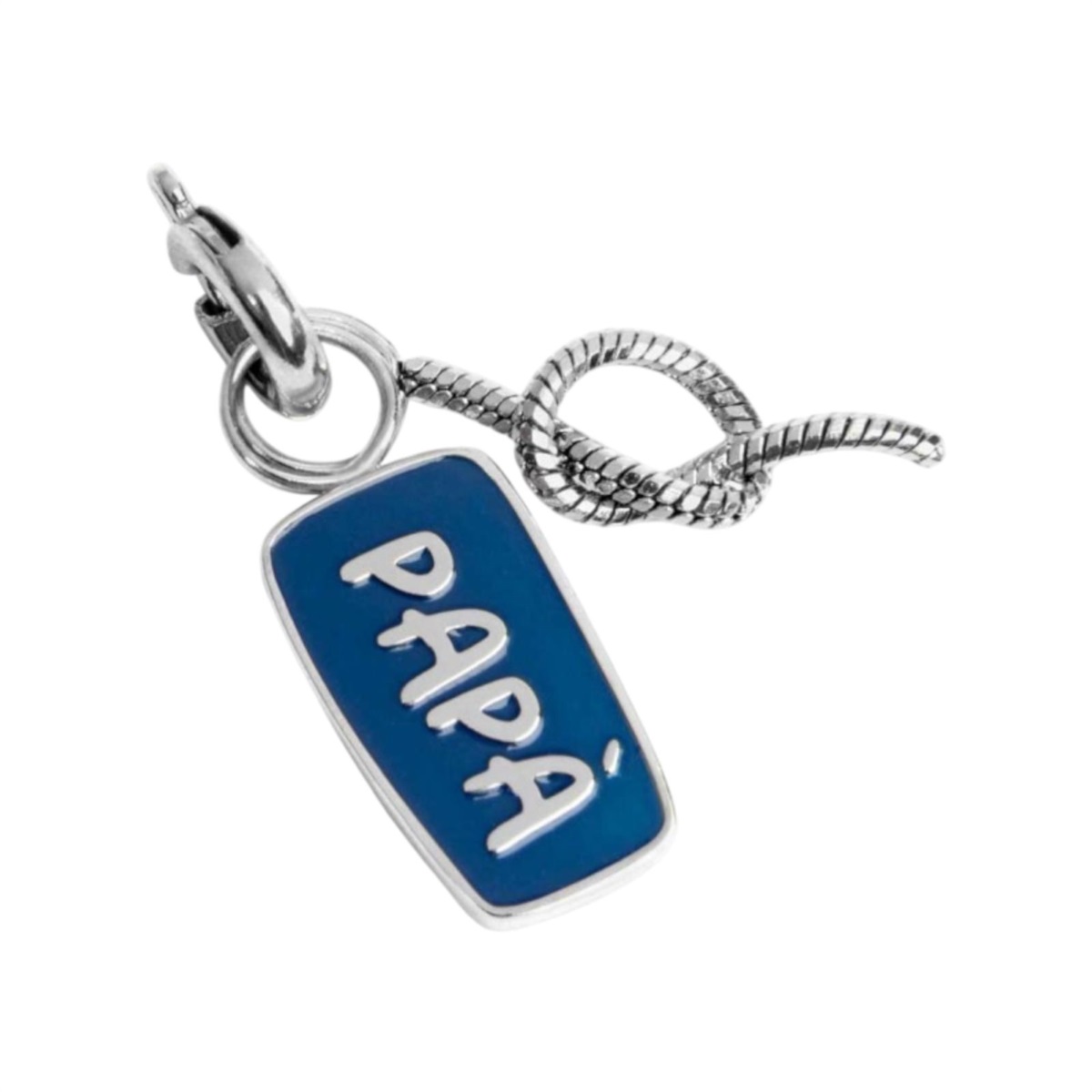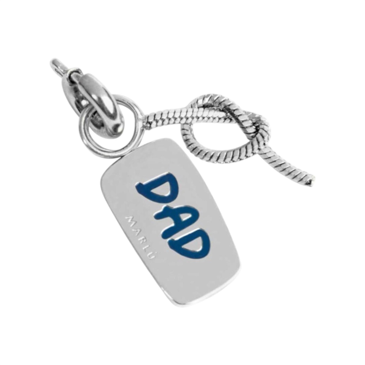 Charm uomo Marlù della collezione Knoted To My Heart realizzato in acciaio color silver con nodo in catena snake e piastrina smaltata blu con scritta "PAPA'" in rilievo e sul retro la scritta "DAD" smaltata blu.