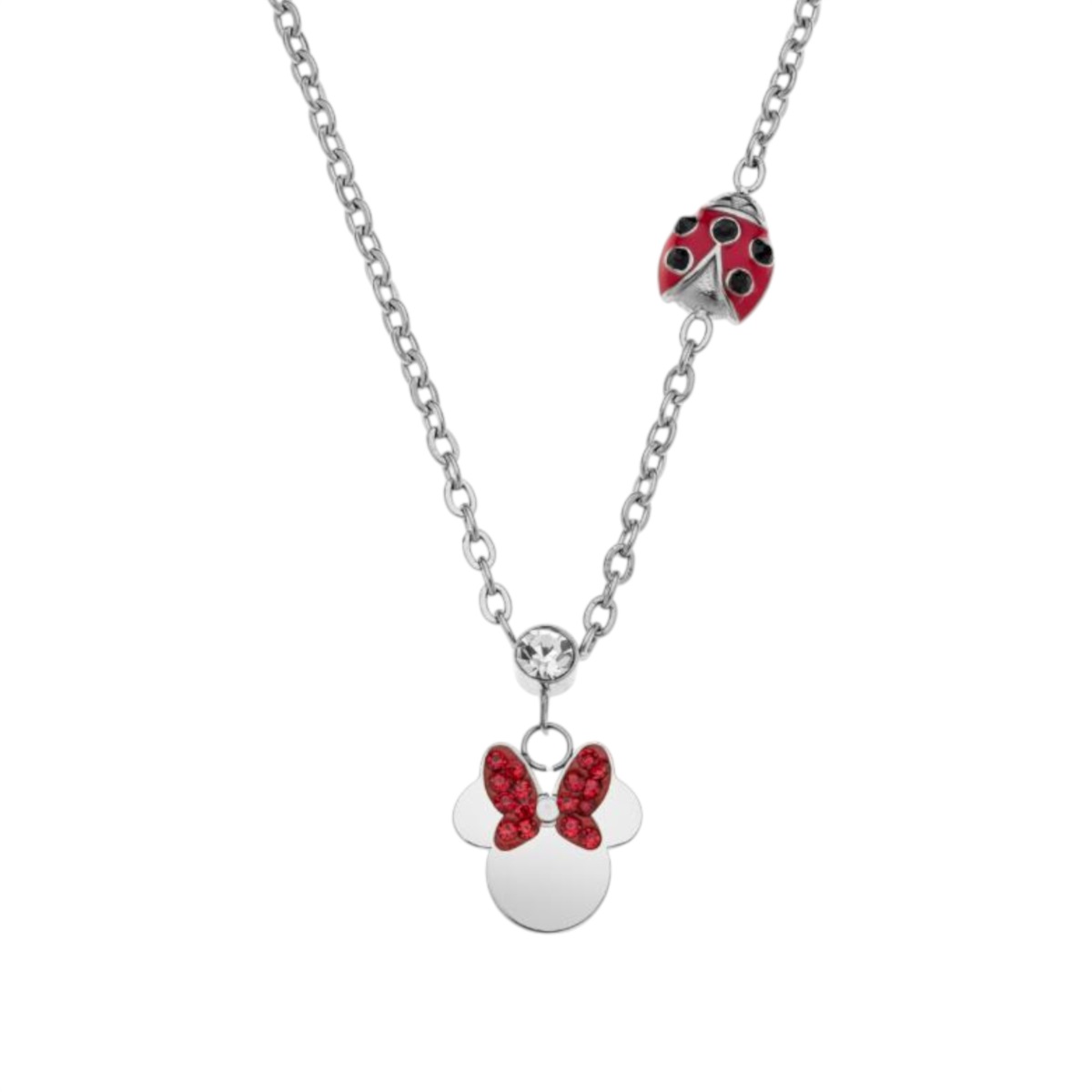 Collana Disney Minnie in acciaio color silver – Collezione Mickey MouseRegala un tocco di magia Disney con questa splendida collana per bambine ispirata a Minnie Mouse, simbolo di dolcezza e allegria!Realizzata in acciaio color silver di alta qualità, presenta una catena a maglia rolò lucente e resistente, impreziosita da un pendente raffigurante Minnie con il suo iconico fiocco rosso decorato da scintillanti pietre rosse.