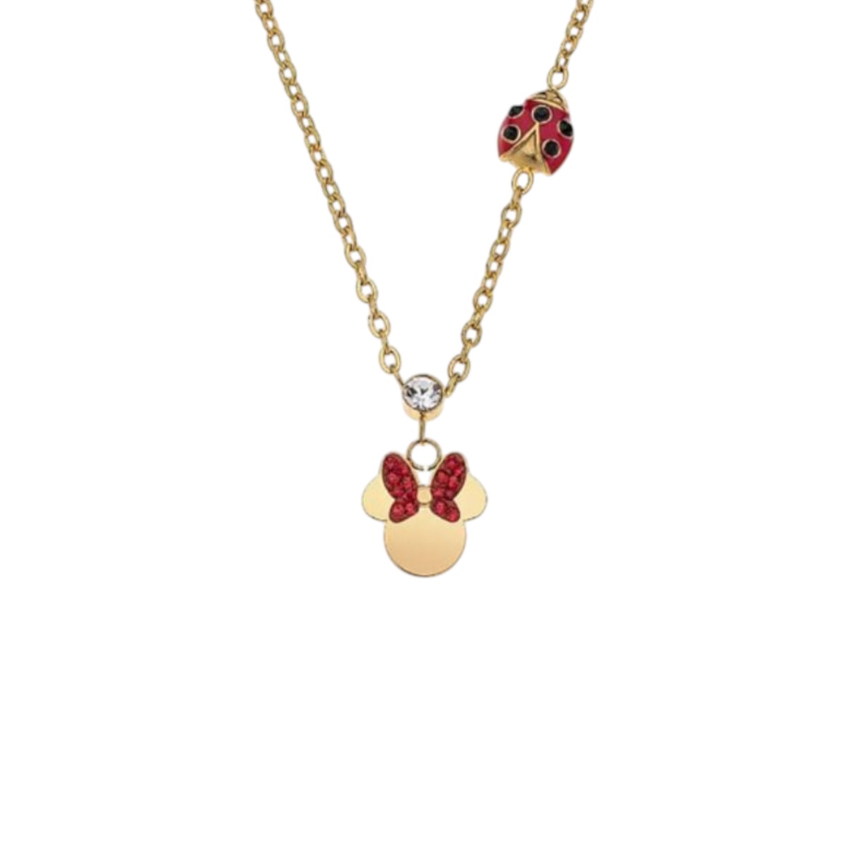 Collana Disney Minnie in acciaio color oro – Collezione Mickey MouseRegala un tocco di magia Disney con questa splendida collana per bambine ispirata a Minnie Mouse, simbolo di dolcezza e allegria!Realizzata in acciaio color oro di alta qualità, presenta una catena a maglia rolò lucente e resistente, impreziosita da un pendente raffigurante Minnie con il suo iconico fiocco rosso decorato da scintillanti pietre rosse.