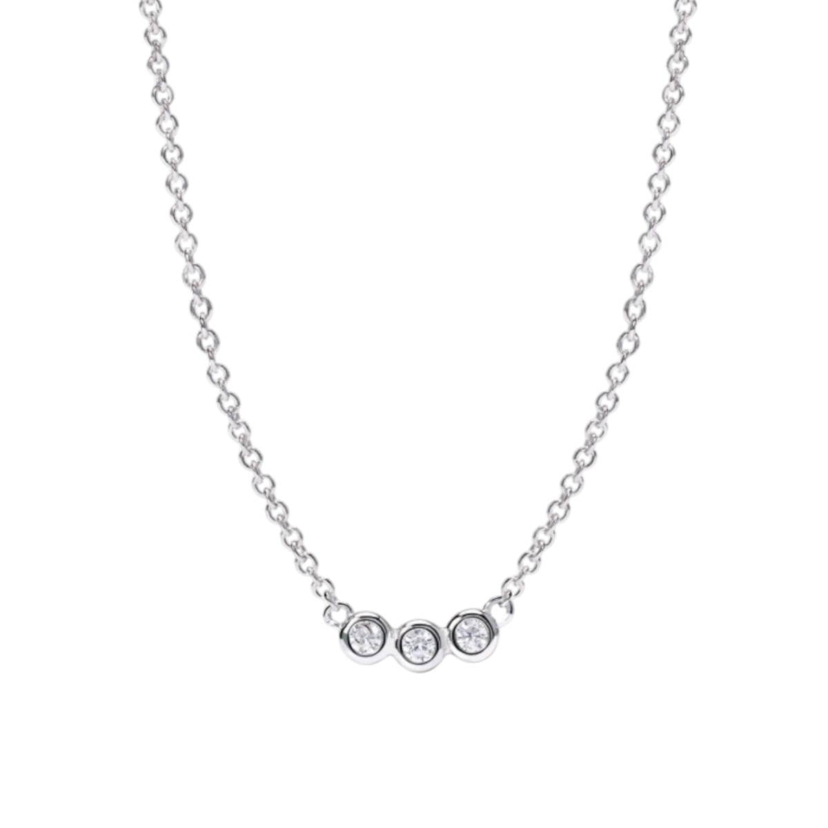 Il pendente, tre diamanti lab-grown, per un totale di 0,08 carati finemente incastonati in tre cerchi, cattura la luce con una brillantezza straordinaria, trasformando la semplicità in un segno distintivo di classe. Questo punto luce è l’emblema di una bellezza autentica e consapevole, pensato per chi ama la purezza dei dettagli e la luminosità discreta di un gioiello intramontabile.
