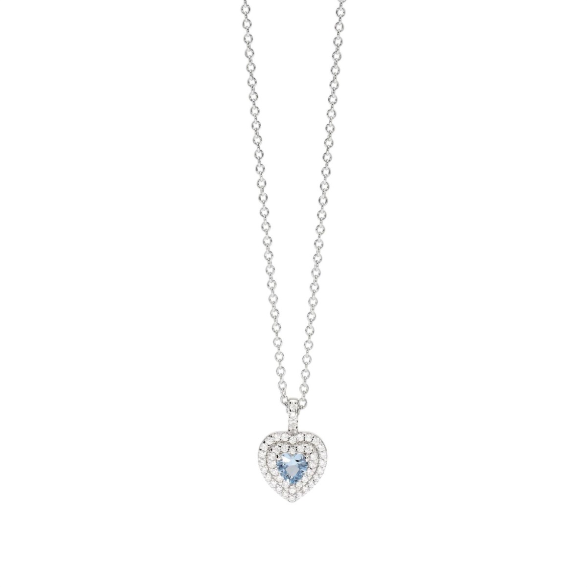 Collana donna Mabina della collezione Vittoria realizzata in argento rodiato con catena rolò e acquamarina sintetica taglio cuore con zirconi.