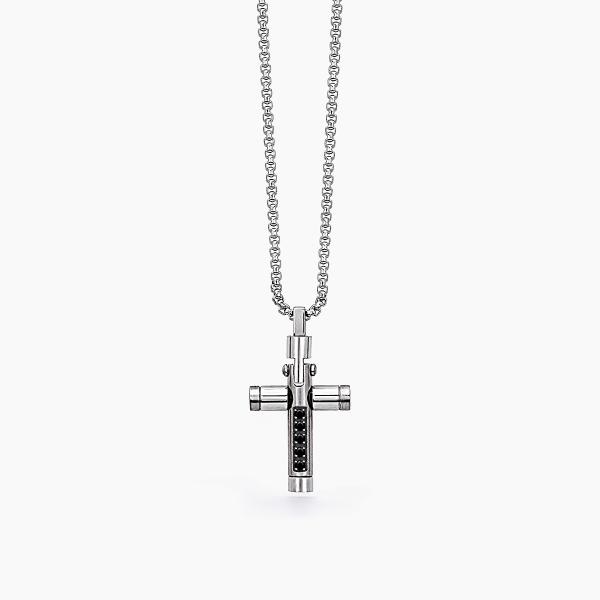 Collana da Uomo della Collezione Faith con pendente croce con cristalli neri, lunghezza 50 cm. Chiusura con moschettone.