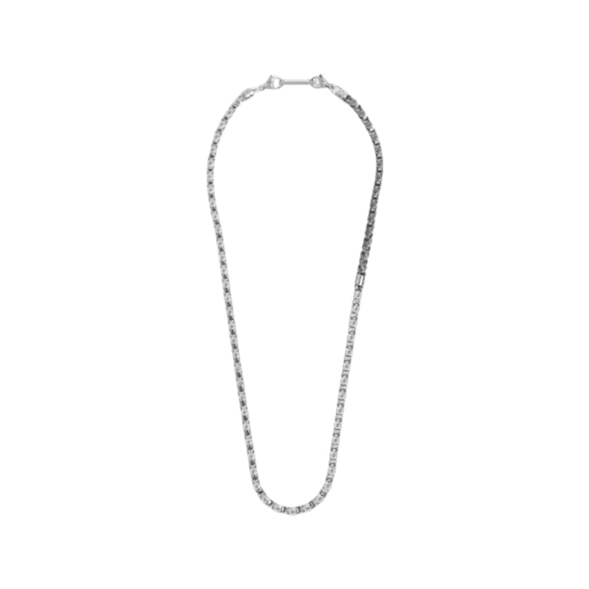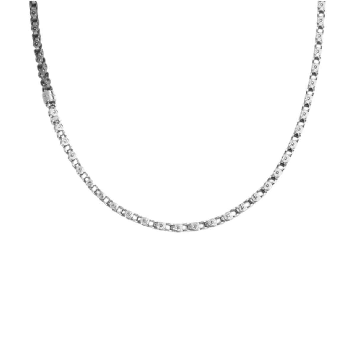 Collana uomo Marlù della collezione Icons realizzato da una parte con catena marine mechanical in acciaio lucido color silver e da una parte in acciaio satinato color titanio, collegate da un elemento cilindrico.