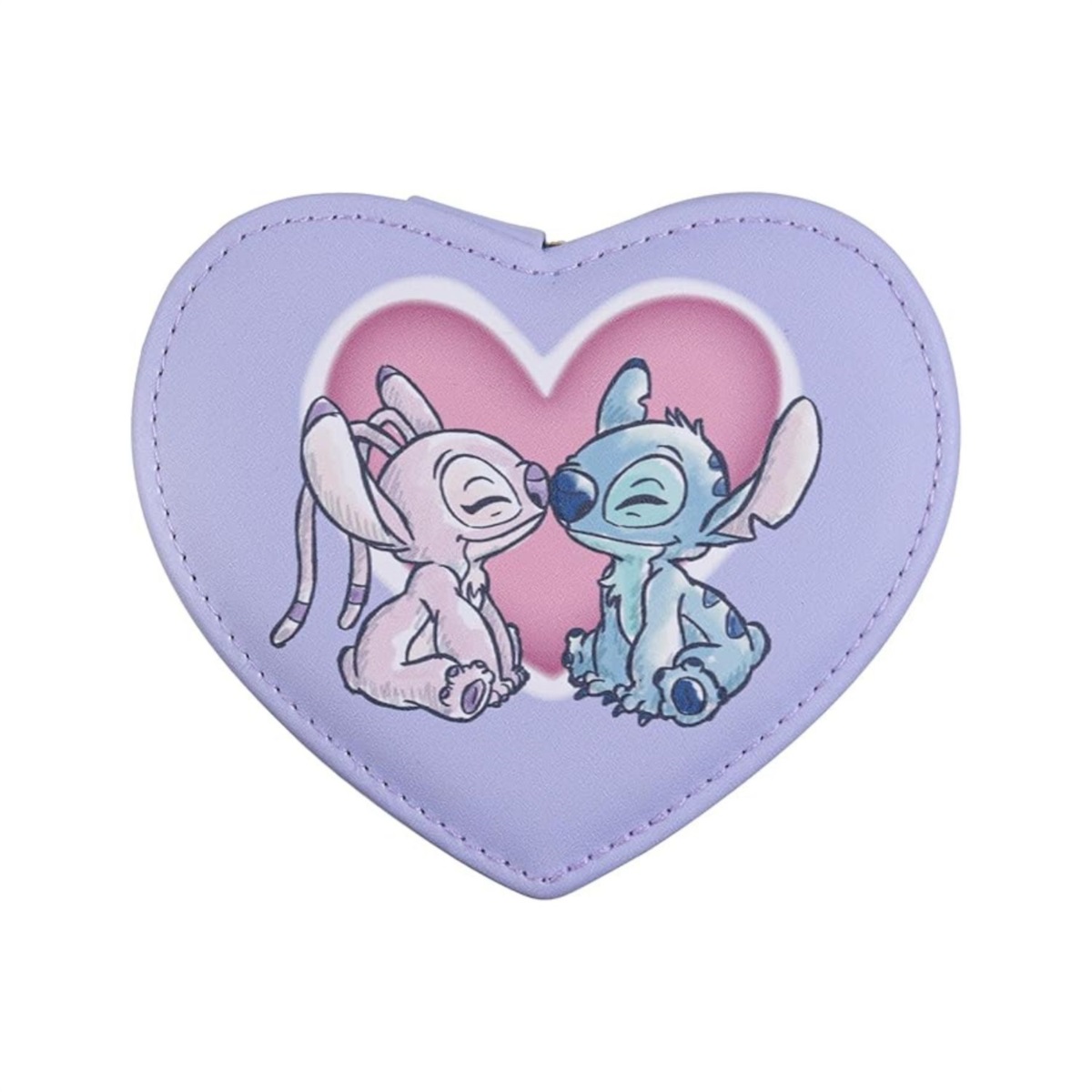 Il contrasto di colori rende questo accessorio ancora più incantevole: esterno lilla e interno celeste chiaro, per un effetto delicato e raffinato.Sulla parte superiore del cuore è raffigurato un grande cuore rosa con al centro Stitch e Angel che si baciano, un disegno romantico e dolcissimo che farà innamorare ogni piccola fan Disney.