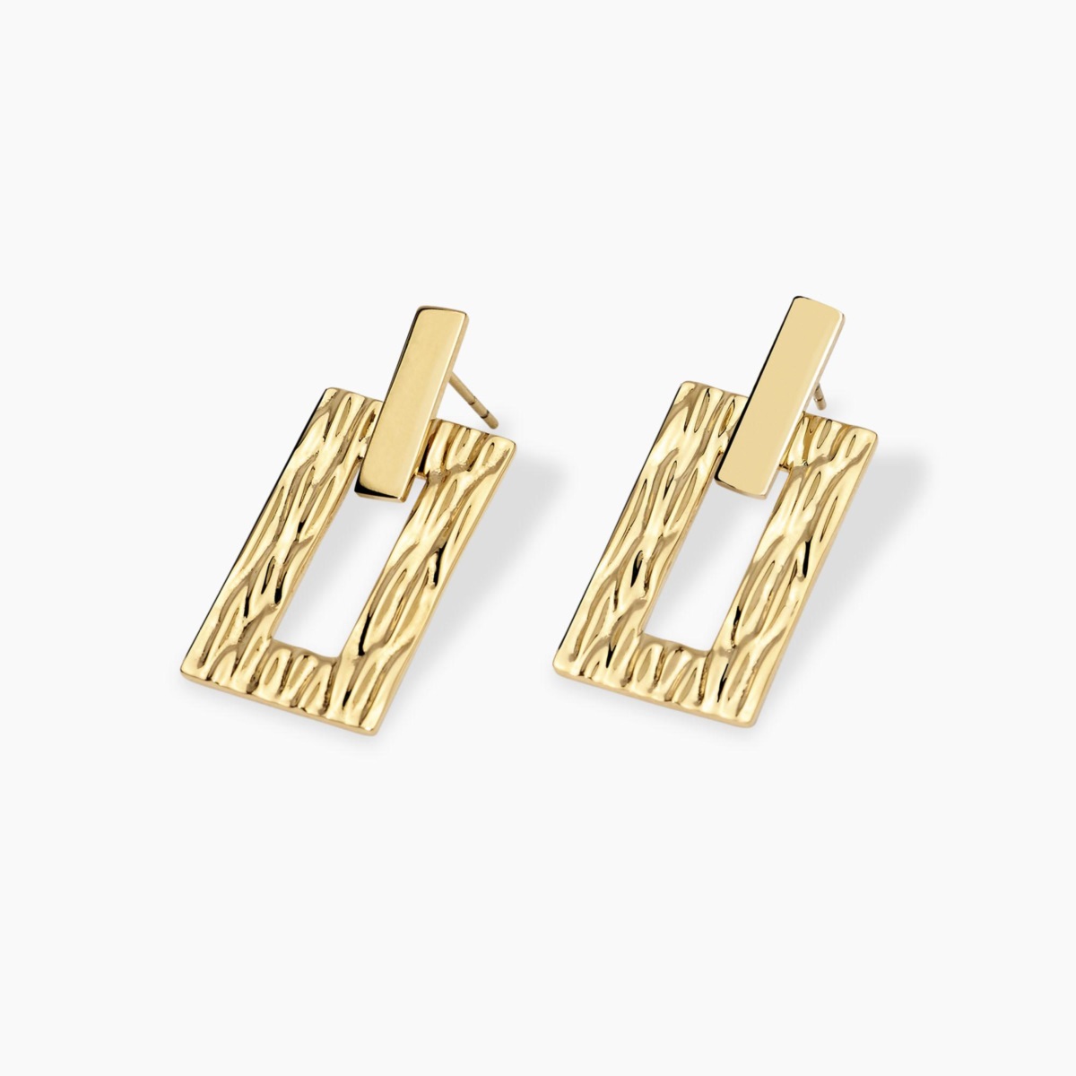 Orecchini Donna Kidult >Eleganti e dal design contemporaneo, questi orecchini con pendenti rettangolari martellati uniscono stile e luce grazie alla finitura PVD giallo sull’acciaio 316L. La chiusura a perno con gommino interno garantisce comfort e sicurezza durante l’uso quotidiano.