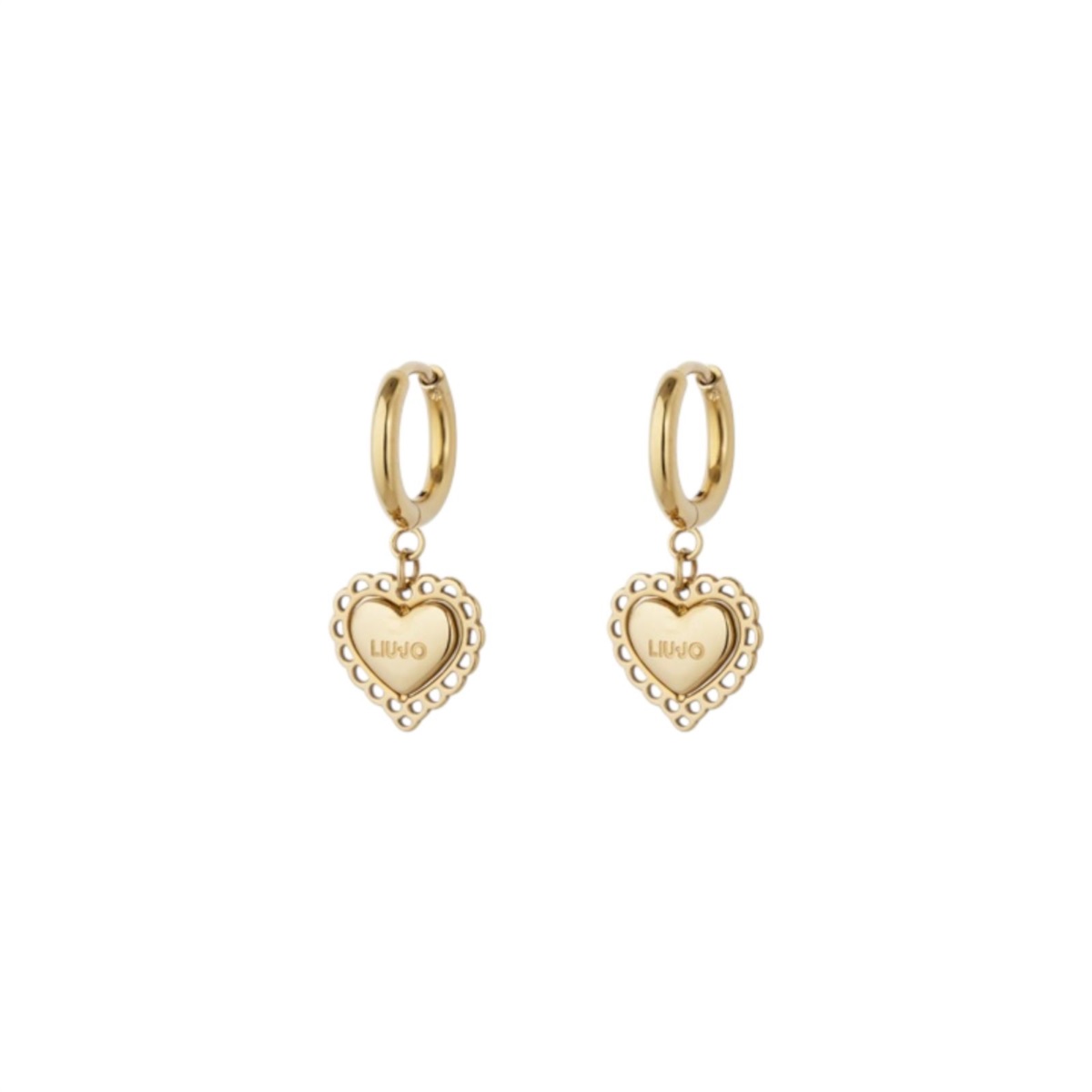 Orecchini donna Liu Jo della collezione Essential Woman realizzati in acciaio color oro giallo a cerchio con cuore pendente.