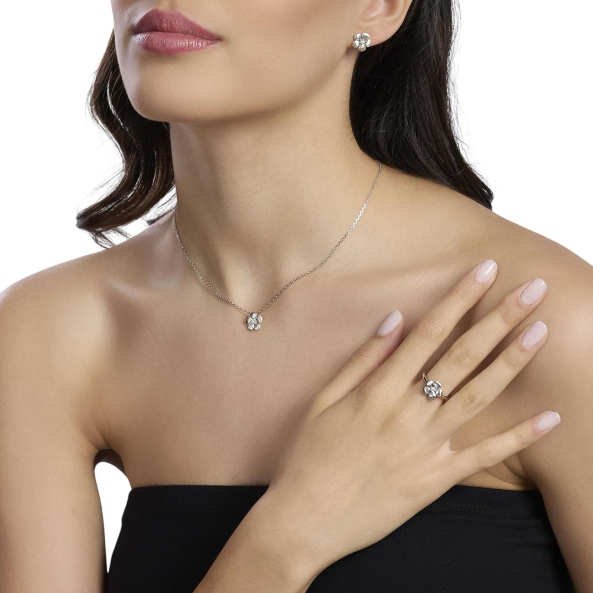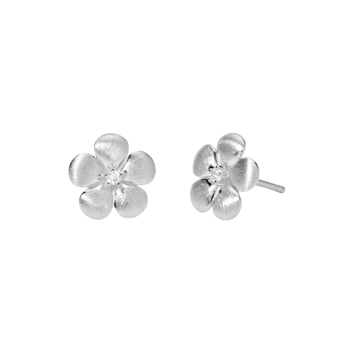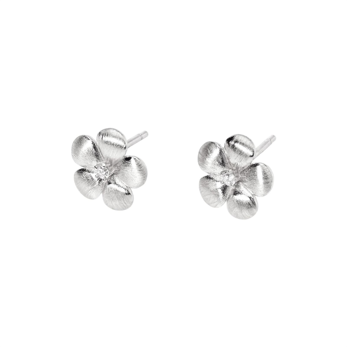 Orecchini donna Mabina della collezione Maledetta realizzati in argento bulinato a forma di fiore impreziosito da un zircone bianco.