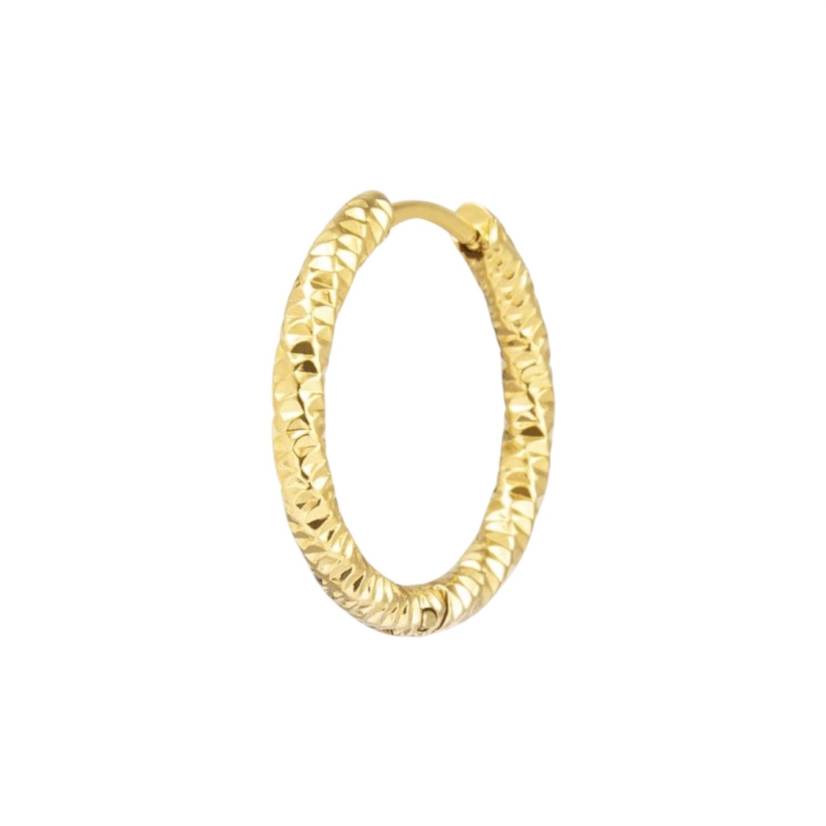 Mono orecchino unisex Marlù della collezione Vision realizzato in acciaio color oro giallo a cerchio con trama diamantata.