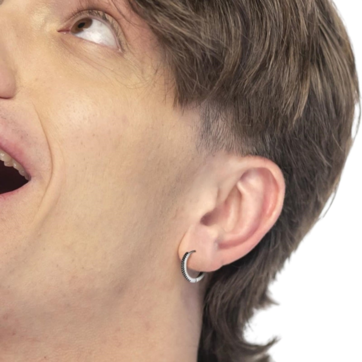 Mono orecchino uomo Marlù della collezione Vision realizzato in acciaio color silver a cerchio con trama puntinata in black oil opaco.