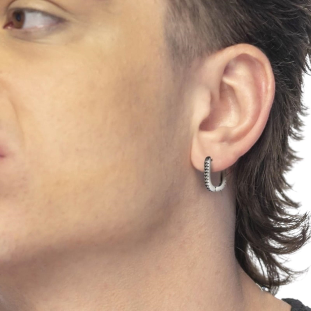 Mono orecchino uomo Marlù della collezione Vision realizzato in acciaio color silver ovale con trama in black oil opaco.