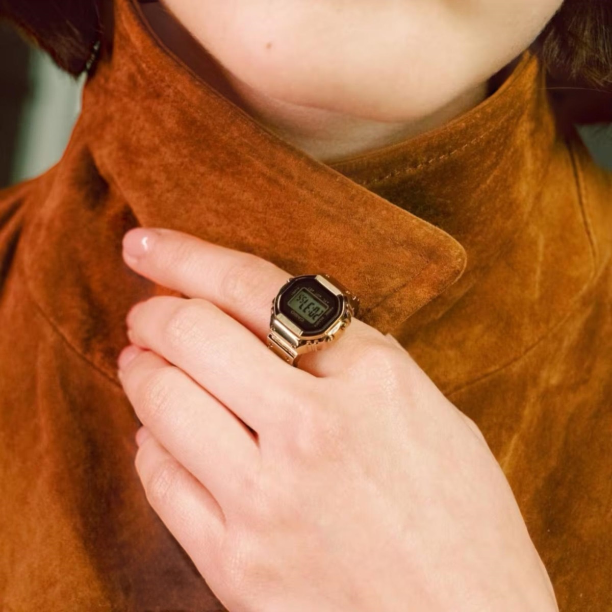 Orologio ad anello unisex Casio realizzato con cassa in acciaio color oro giallo con un diametro di 25.2 x 19.5 mm e uno spessore di 6.2 mm.