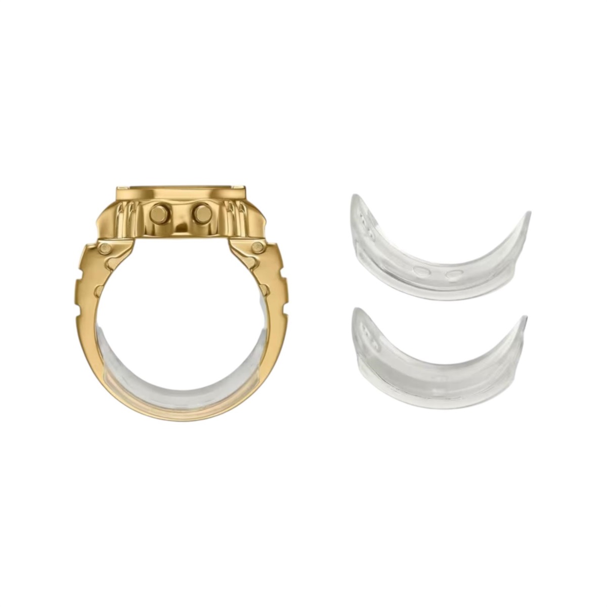 Il cinturino è realizzato in acciaio color oro giallo. L'anello è adatto a un dito di taglia 22, sono inoltre inclusi due distanzianti di regolazione per taglie 19 e 16.