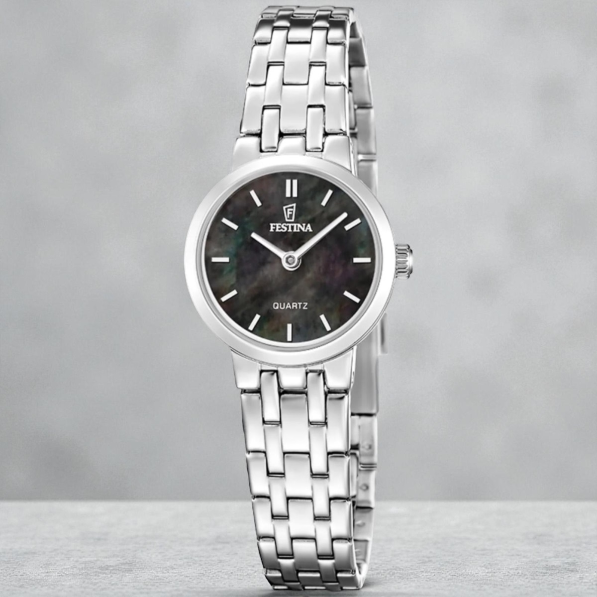 Orologio donna Festina della collezione Mademoiselle realizzato con cassa in acciaio color silver con un diametro di 23 mm e uno spessore di 8 mm.