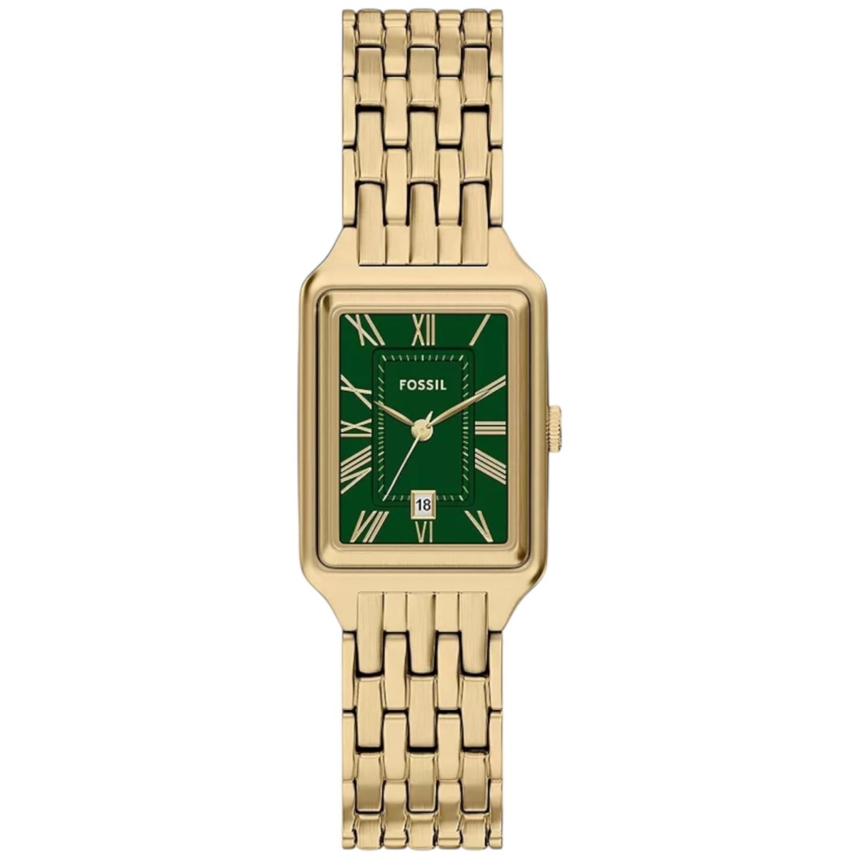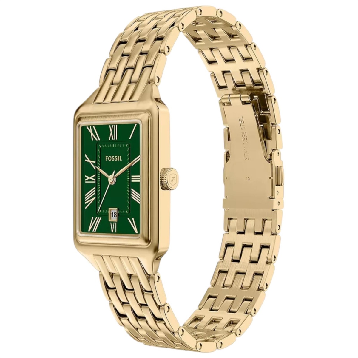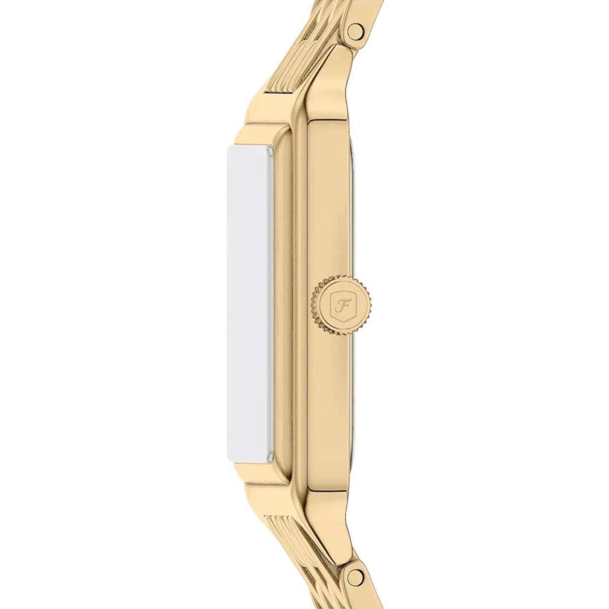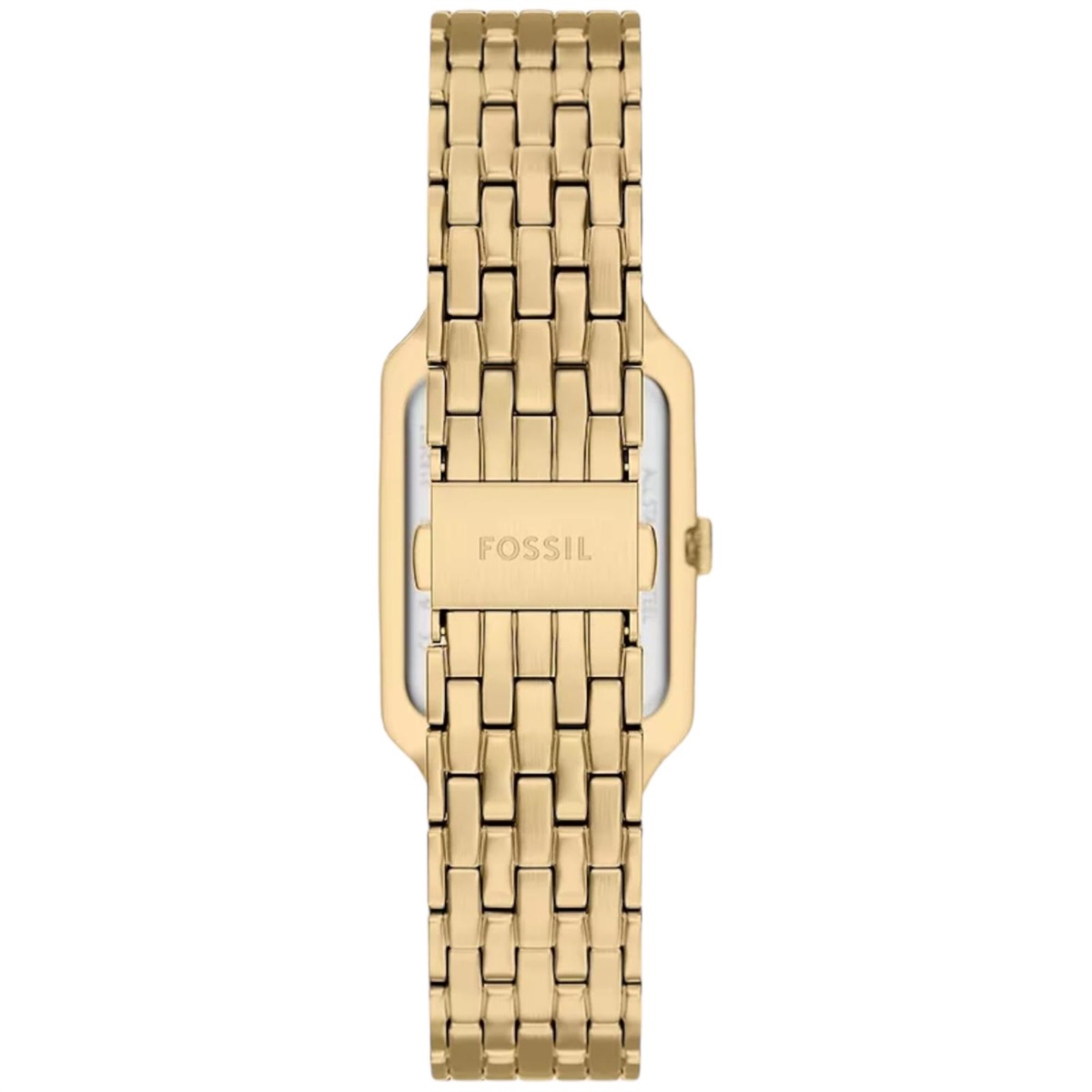 Orologio donna Fossil della collezione Raquel realizzato con cassa in acciaio color oro giallo con un diametro di 23 mm e uno spessore di 8 mm.
