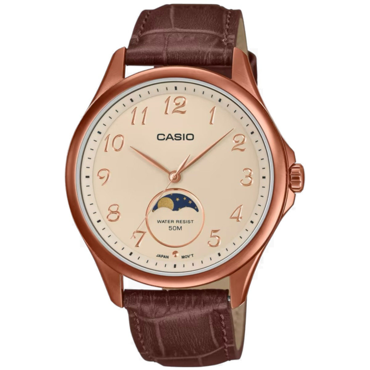 Orologio uomo Casio della collezione Mtp-M110 realizzato con cassa in acciaio color oro rosa con un diametro di 48.4 x 42.5 mm e uno spessore di 9.6 mm.