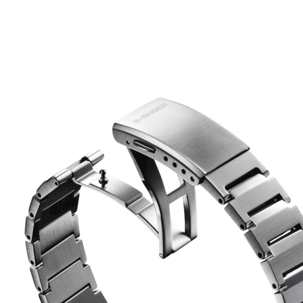 Il cinturino è realizzato in acciaio color silver con una chiusura one-touch tre pieghe.
