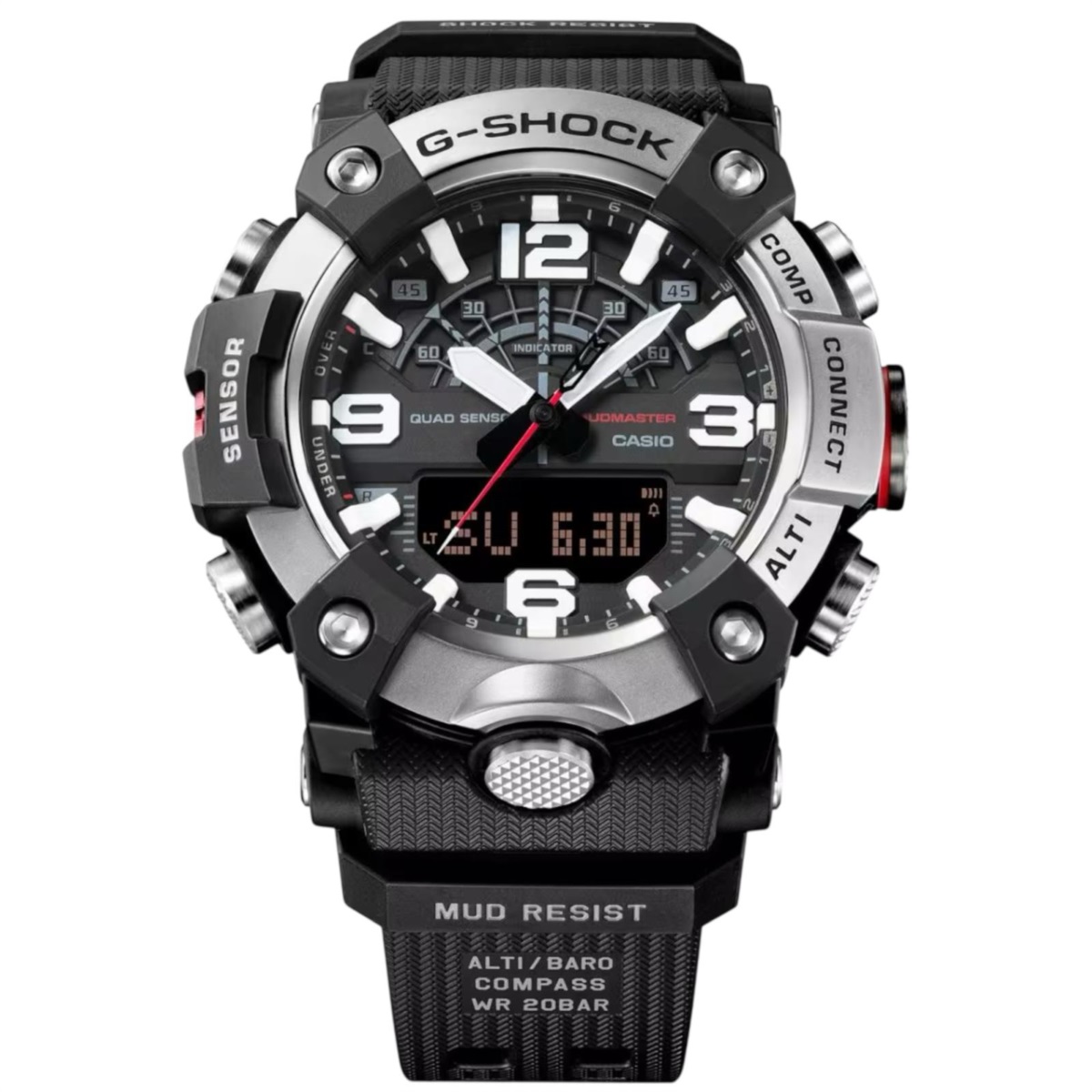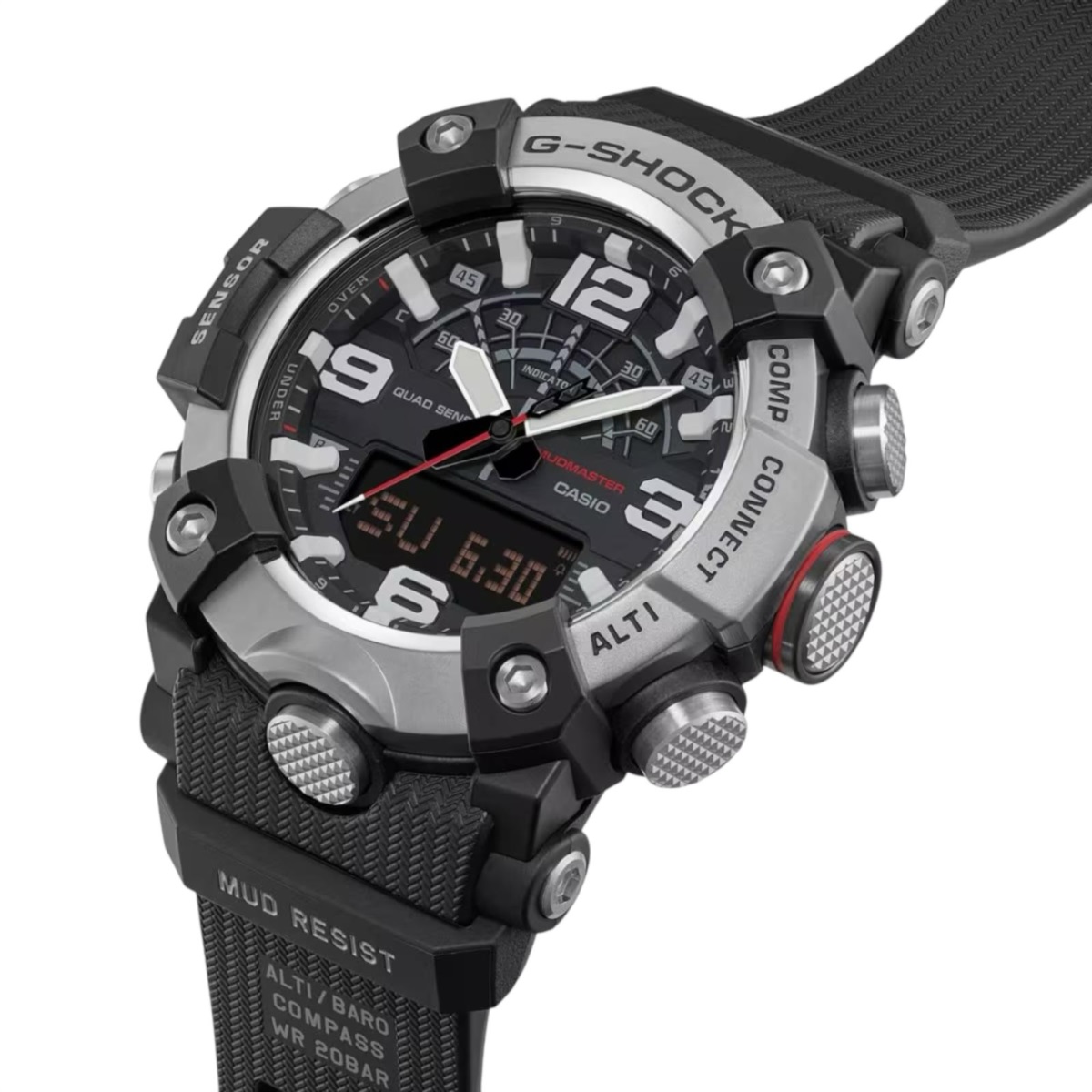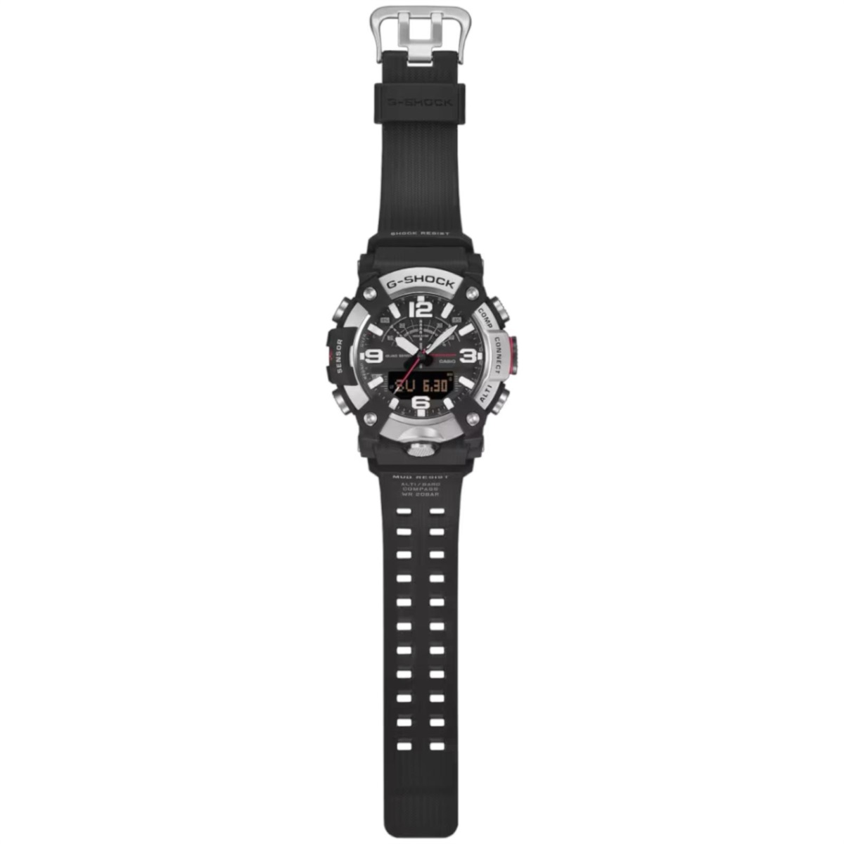 Orologio uomo Casio G-Shock della collezione Mudmaster realizzato con cassa in carbonio a base biologica e acciaio color nero con un diametro di 55.4 x 51.3 mm e uno spessore di 19.4 mm.
