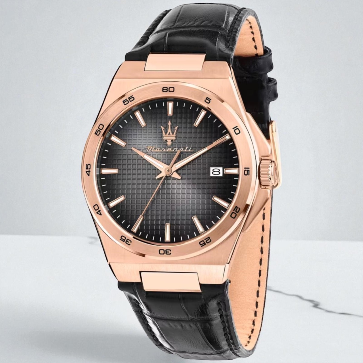 Orologio uomo Maserati della collezione Velocità Slim realizzato con cassa in acciaio color oro rosa con un diametro di 40 mm e uno spessore di 7.78 mm.