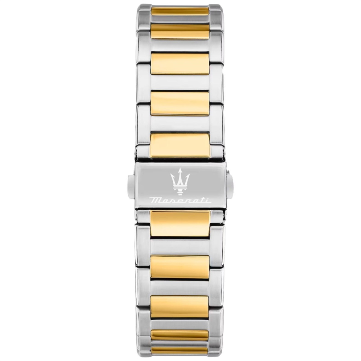 Il cinturino è realizzato in acciaio bicolore silver e oro giallo con una chiusura deployante con doppio pulsante.