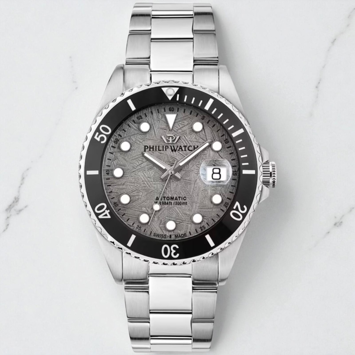 Orologio automatico uomo Philip Watch della collezione Caribe Diving realizzato con cassa in acciaio color silver con un diametro di 42 mm, uno spessore di 12.60 mm e una ghiera girevole color nero.